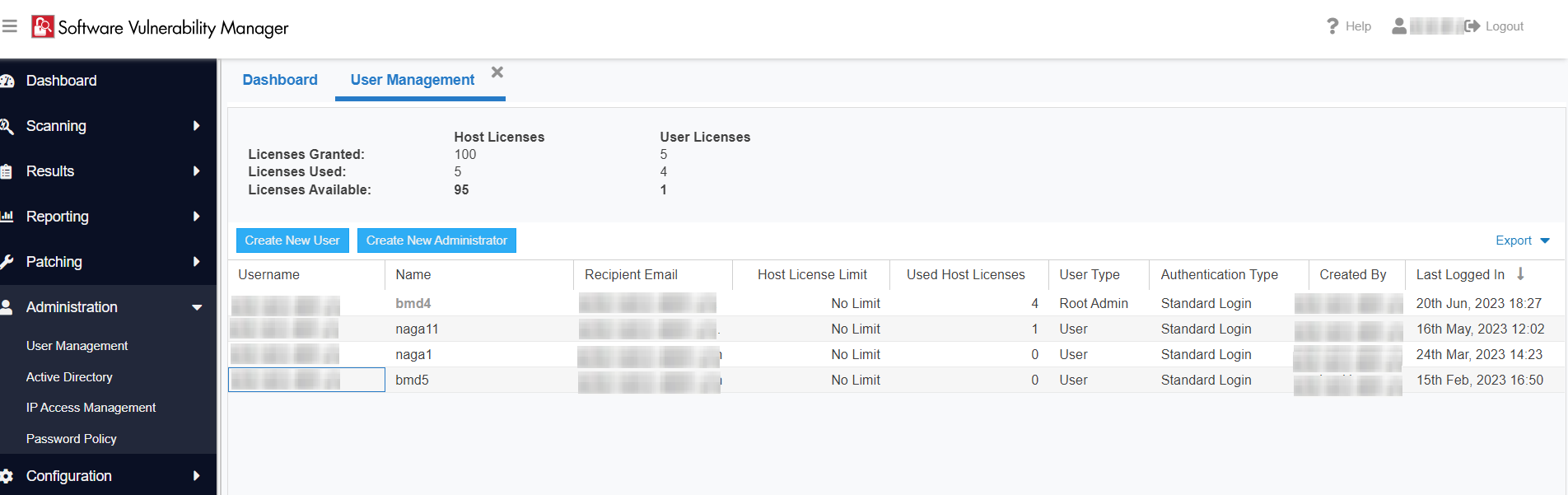 Software Vulnerability Manager (On‑Premises Edition) Help LibraryAdministrationUser ManagementUser Management Use this page to administer your Software Vulnerability Manager users. Create a New Administrator Create a New User