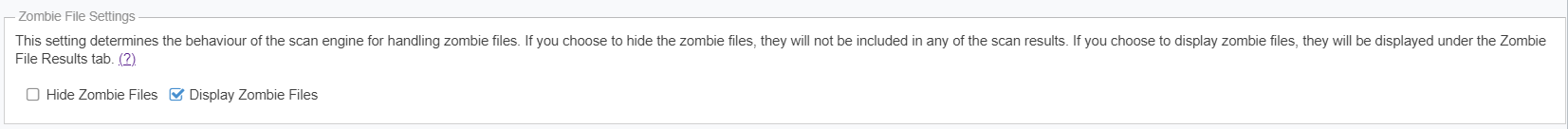 The Display Zombie Files check box option enables only when the Hide Zombie Files option is unchecked. With the Display Zombie Files check box enable, the discovered zombie files will be displayed in the Scanning > Completed Scans > View Scan Result > Zombie File Results tab. For more information, see Zombie File Results.