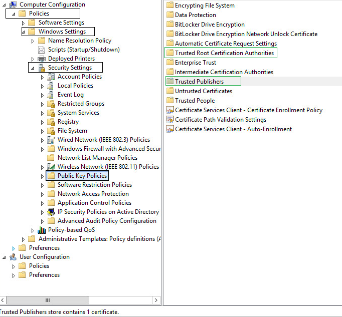 Navigate to Computer Configuration > Policies > Windows Settings > Security Settings > Public Key Policies.