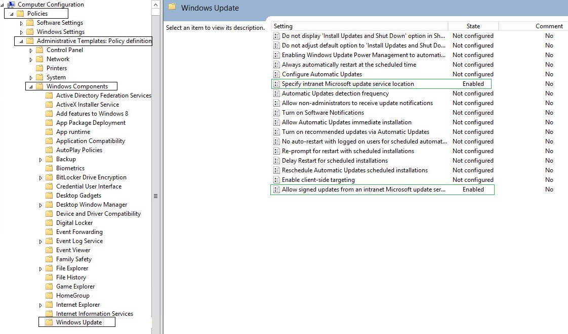On the right side menu, double-click Allow signed updates from an intranet Microsoft update service location. Select Enabled and click OK.