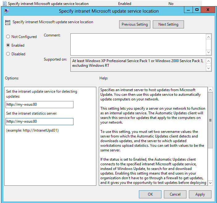 On the right side menu, double-click Specify intranet Microsoft update service location. Enable this setting and modify the existing empty fields with the intranet address of your WSUS Server. This step is only valid for WSUS integration and is not required for System Center Configuration Manager integration.