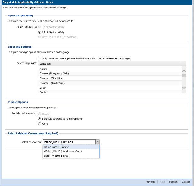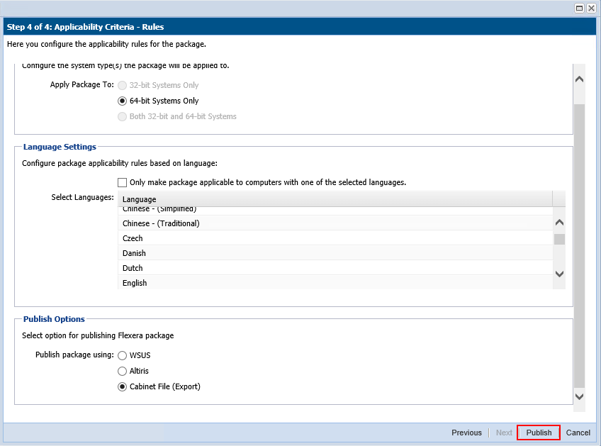 In Step 4 you should specify if you want to limit the package to 32-bit or 64-bit systems or computers with specific operating system languages. The patch file to be deployed will be automatically downloaded in the background by the Software Vulnerability Manager console. Once this is completed the Software Vulnerability Manager console will publish the update package into the WSUS/System Center.
