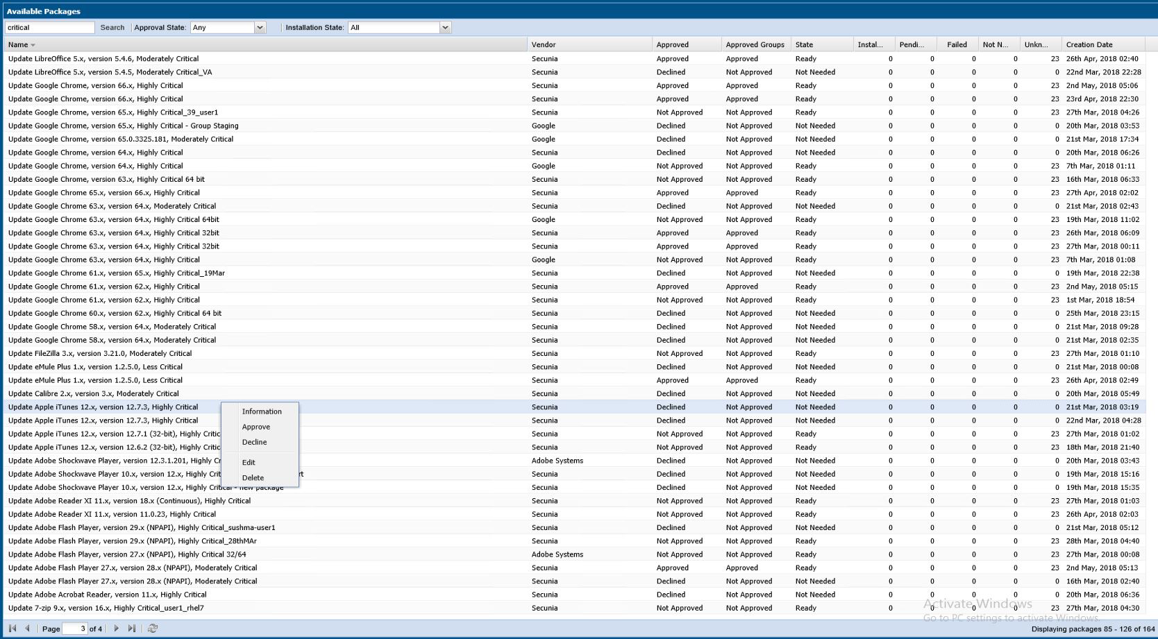 Right-click a package for more options such as Approve, Decline or Delete or double-click a package to display additional status details.