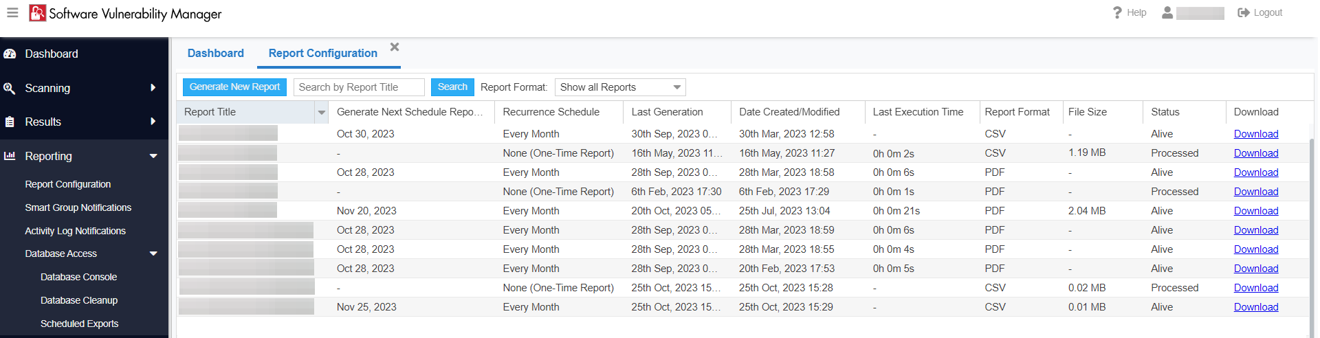 Use this page to view a list of reports that have been configured and scheduled for generation. You can configure a new report by clicking Generate New Report or right-click an existing report to view, edit or delete it (For more information, see Generate a New Report). The Software Vulnerability Manager reporting capabilities allow the user to schedule and fully customize the intended report.
