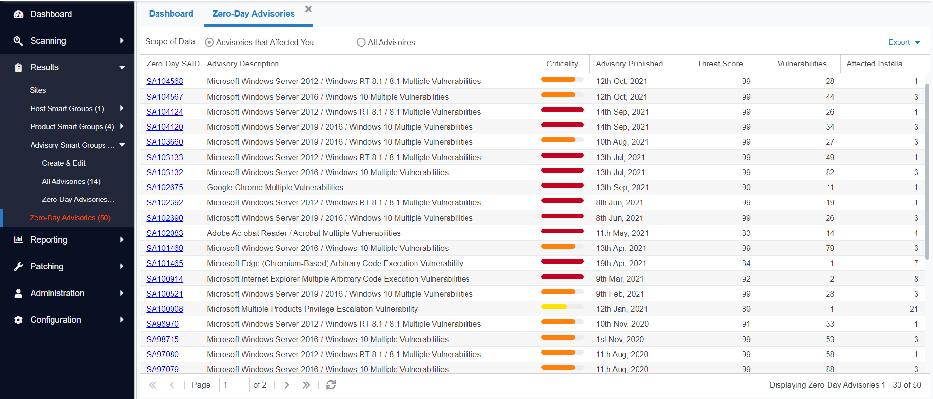 Zero-Day Advisories reference a vulnerability that is actively exploited prior to its disclosure. These advisories can be filtered by Advisories that Affected You and All Advisories.